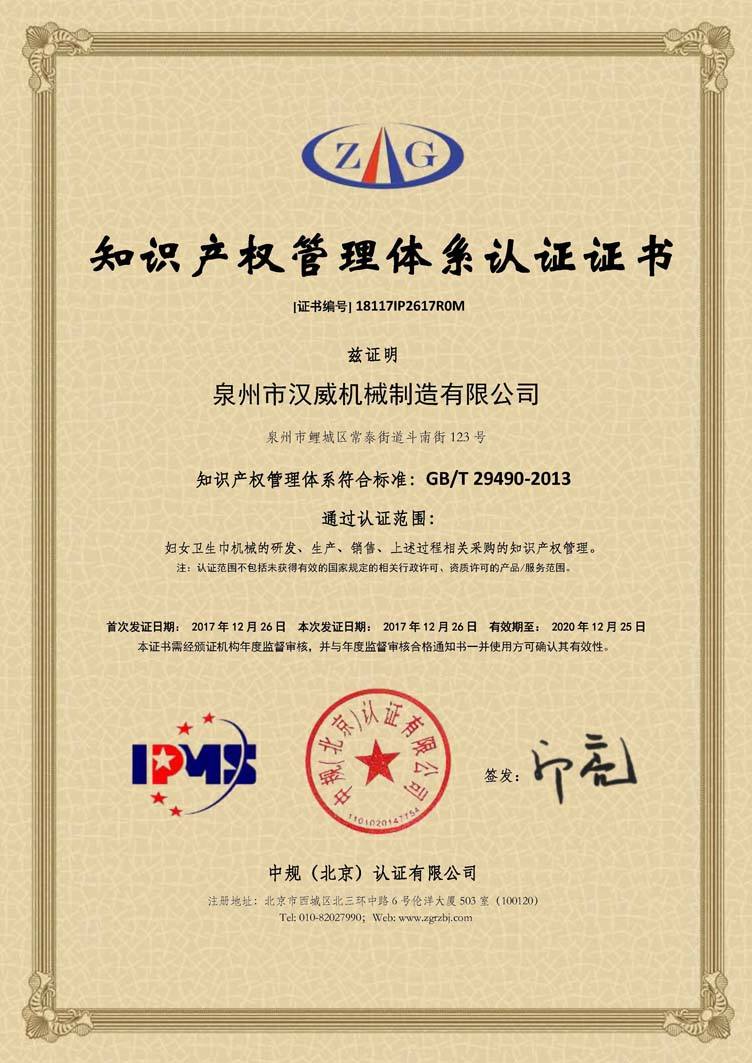 2017年12月29日,泉州市汉威机械制造有限公司收到由中规(北京)认证有限公司颁发的《知识产权管理体系认证证书》,这意味着汉威公司在知识产权领域获得到重要认可,在知识产权方面得到进一步规范和在综合竞争力得到进一步提升。