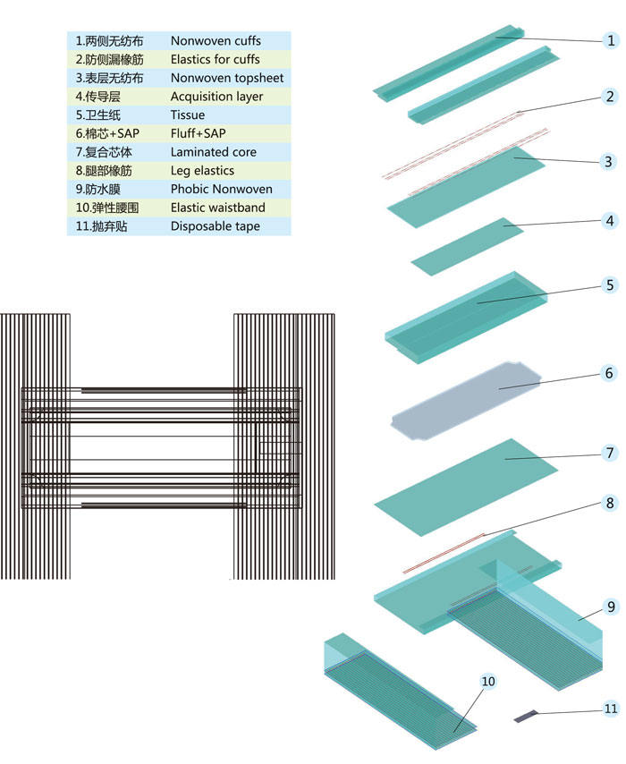 速度范围350 - 450 PPM棉芯为上下层双棉芯结构,可兼容生产超薄复合芯体和半复合芯体的产品。采用独立单根橡筋张力可控,腿部可做X型松紧橡筋。腰部橡筋缝合采用超声波焊接技术。产品质量分检系统(包括重量、金属物、外观、位置)。